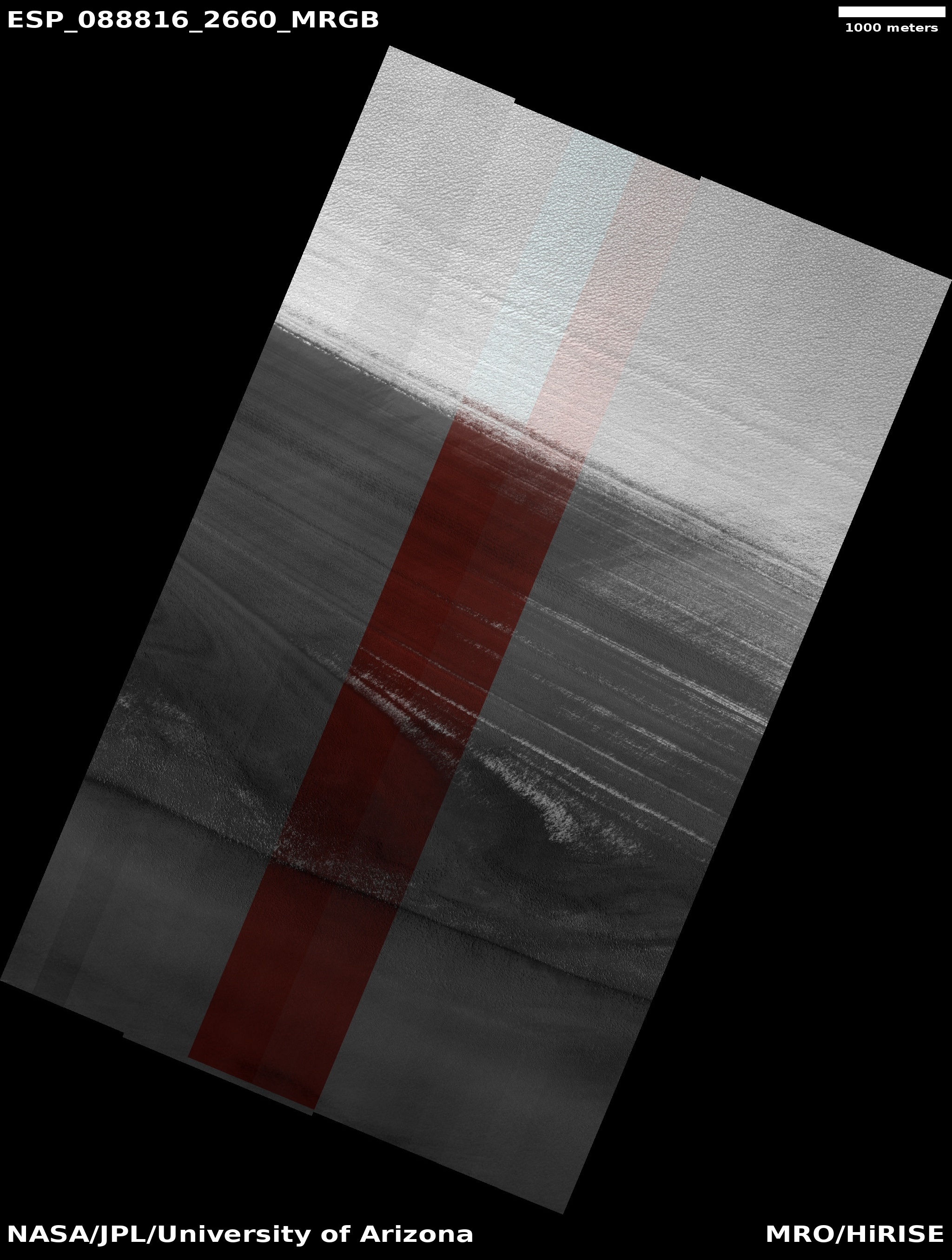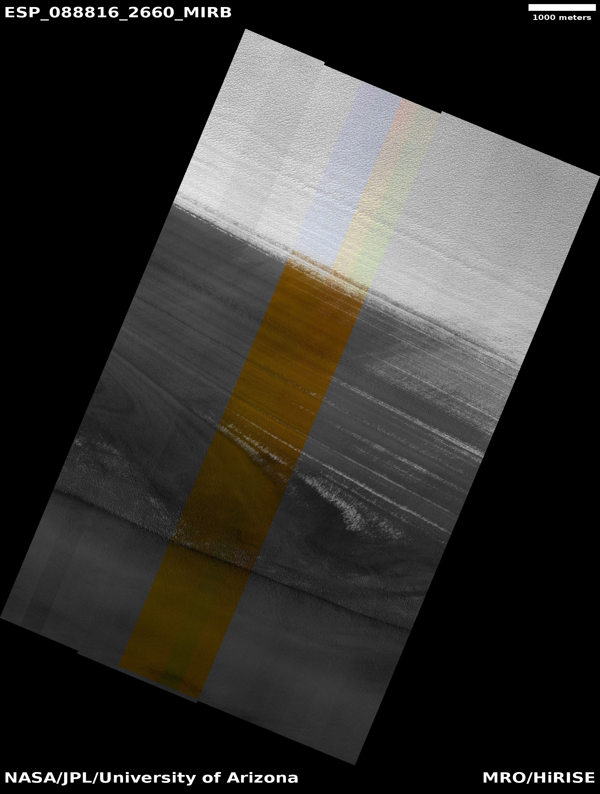 ADDITIONAL INFORMATION B&W label Color label Merged IRB label Merged RGB label EDR products HiView NB IRB: infrared-red-blue RGB: red-green-blue About color products (PDF) Black & white is 5 km across; enhanced color about 1 km For scale, use JPEG/JP2 black & white map-projected images USAGE POLICY All of the images produced by HiRISE and accessible on this site are within the public domain: there are no restrictions on their usage by anyone in the public, including news or science organizations. We do ask for a credit line where possible: NASA/JPL-Caltech/UArizona POSTSCRIPT NASA’s Jet Propulsion Laboratory, a division of the California Institute of Technology in Pasadena, Calif., manages the Mars Reconnaissance Orbiter for NASA’s Science Mission Directorate, Washington. The HiRISE camera was built by Ball Aerospace and Technology Corporation and is operated by the University of Arizona. |