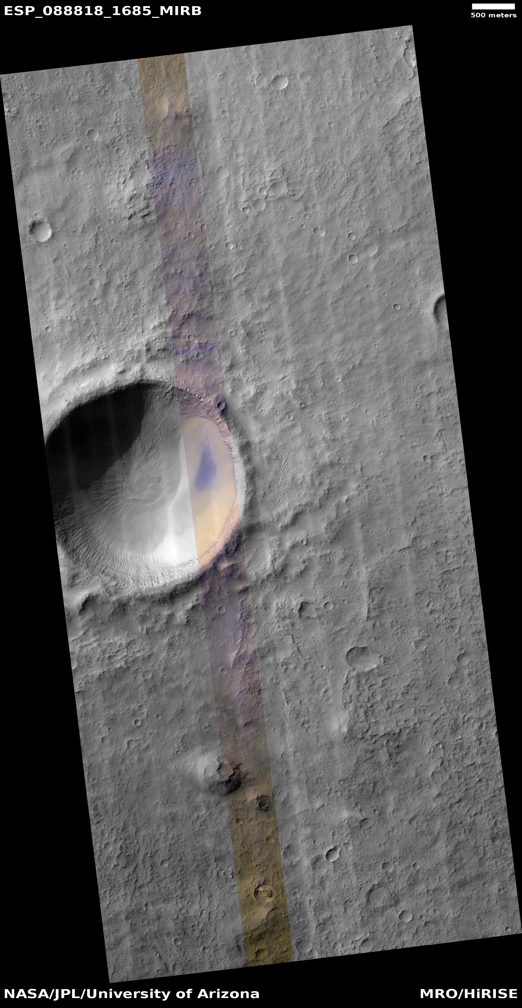 ADDITIONAL INFORMATION B&W label Color label Merged IRB label Merged RGB label EDR products HiView NB IRB: infrared-red-blue RGB: red-green-blue About color products (PDF) Black & white is 5 km across; enhanced color about 1 km For scale, use JPEG/JP2 black & white map-projected images USAGE POLICY All of the images produced by HiRISE and accessible on this site are within the public domain: there are no restrictions on their usage by anyone in the public, including news or science organizations. We do ask for a credit line where possible: NASA/JPL-Caltech/UArizona POSTSCRIPT NASA’s Jet Propulsion Laboratory, a division of the California Institute of Technology in Pasadena, Calif., manages the Mars Reconnaissance Orbiter for NASA’s Science Mission Directorate, Washington. The HiRISE camera was built by Ball Aerospace and Technology Corporation and is operated by the University of Arizona. |