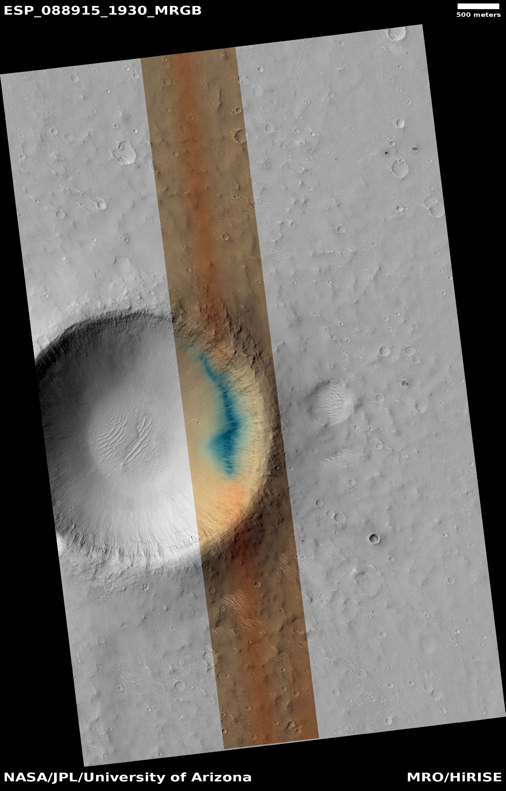 ADDITIONAL INFORMATION B&W label Color label Merged IRB label Merged RGB label EDR products HiView NB IRB: infrared-red-blue RGB: red-green-blue About color products (PDF) Black & white is 5 km across; enhanced color about 1 km For scale, use JPEG/JP2 black & white map-projected images USAGE POLICY All of the images produced by HiRISE and accessible on this site are within the public domain: there are no restrictions on their usage by anyone in the public, including news or science organizations. We do ask for a credit line where possible: NASA/JPL-Caltech/UArizona POSTSCRIPT NASA’s Jet Propulsion Laboratory, a division of the California Institute of Technology in Pasadena, Calif., manages the Mars Reconnaissance Orbiter for NASA’s Science Mission Directorate, Washington. The HiRISE camera was built by Ball Aerospace and Technology Corporation and is operated by the University of Arizona. |