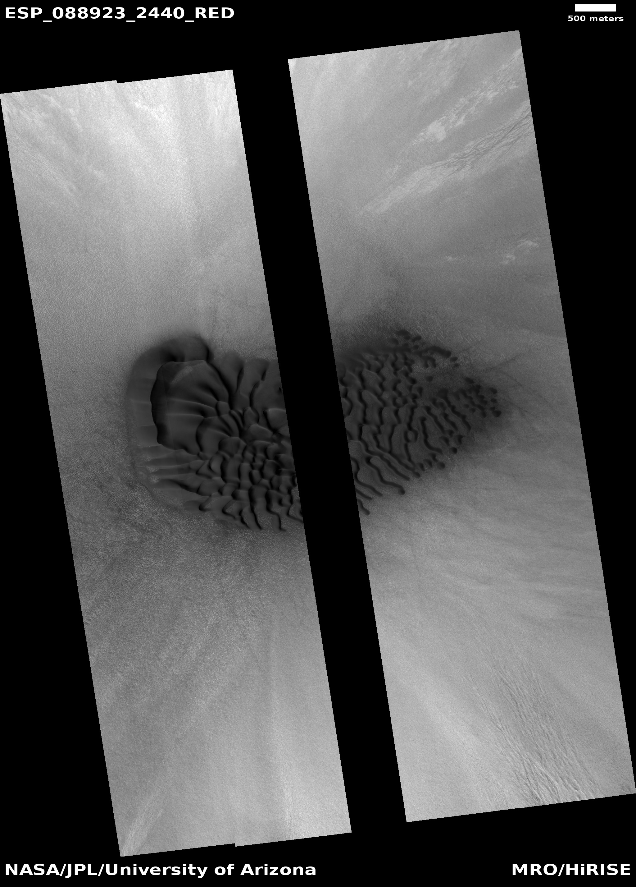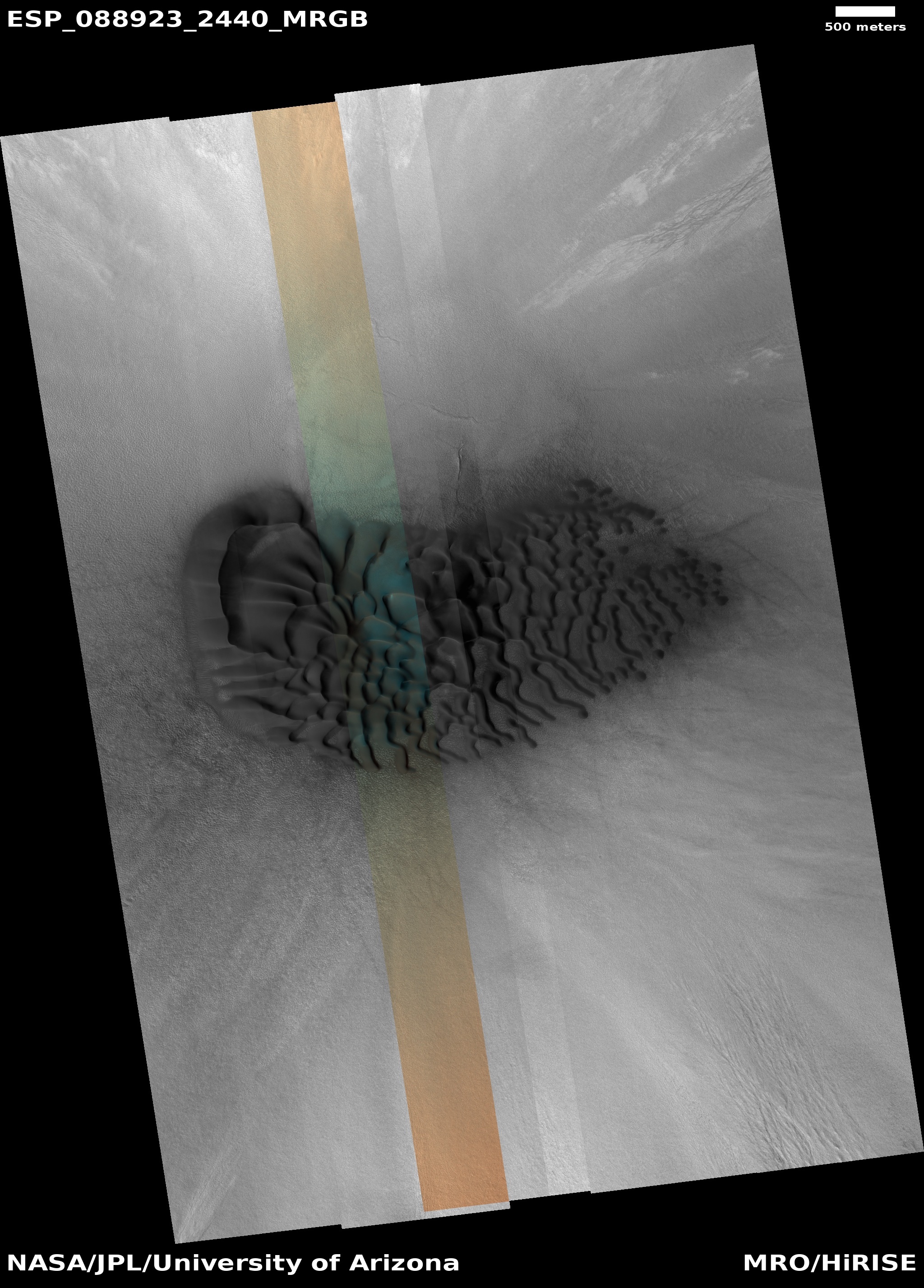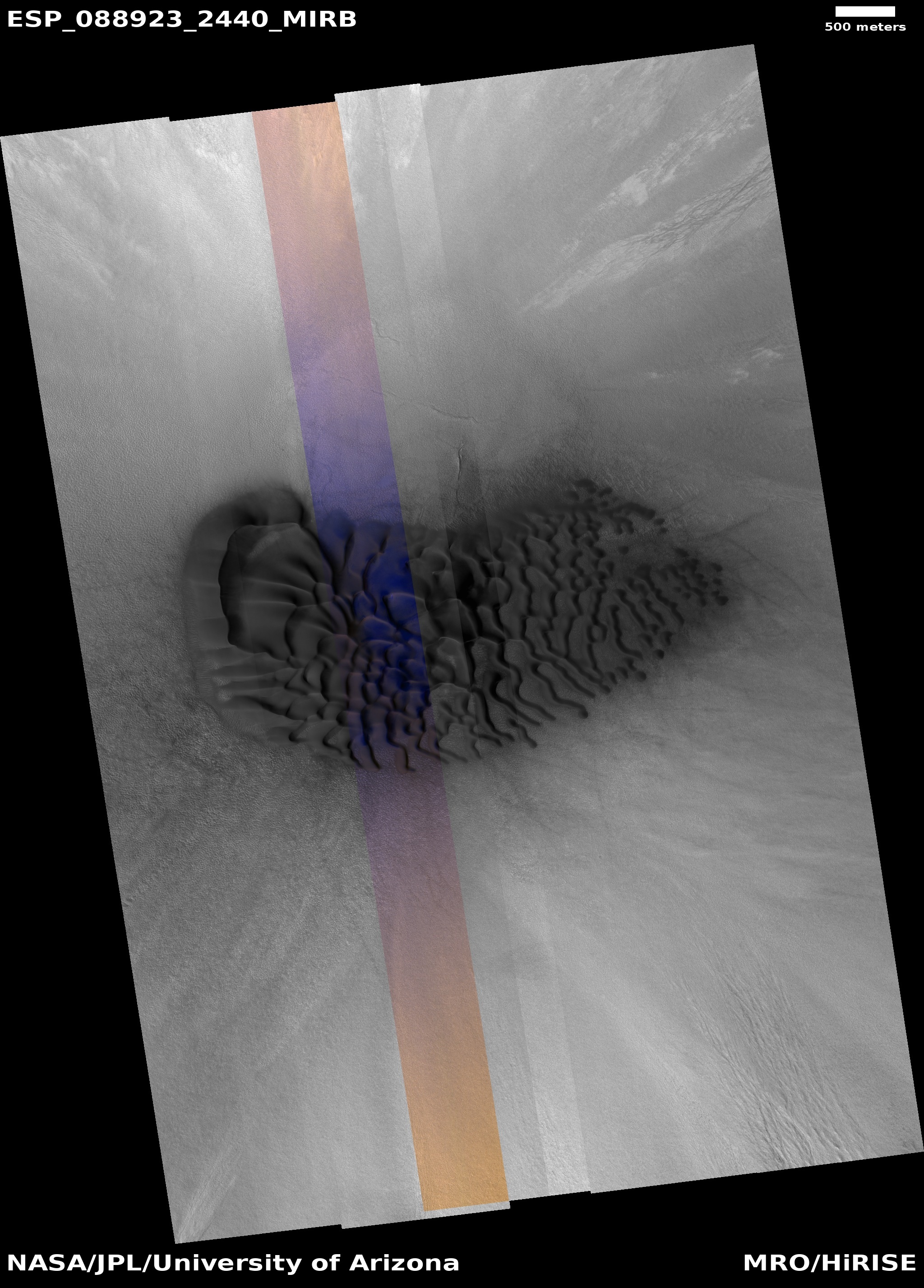ADDITIONAL INFORMATION B&W label Color label Merged IRB label Merged RGB label EDR products HiView NB IRB: infrared-red-blue RGB: red-green-blue About color products (PDF) Black & white is 5 km across; enhanced color about 1 km For scale, use JPEG/JP2 black & white map-projected images USAGE POLICY All of the images produced by HiRISE and accessible on this site are within the public domain: there are no restrictions on their usage by anyone in the public, including news or science organizations. We do ask for a credit line where possible: NASA/JPL-Caltech/UArizona POSTSCRIPT NASA’s Jet Propulsion Laboratory, a division of the California Institute of Technology in Pasadena, Calif., manages the Mars Reconnaissance Orbiter for NASA’s Science Mission Directorate, Washington. The HiRISE camera was built by Ball Aerospace and Technology Corporation and is operated by the University of Arizona. |