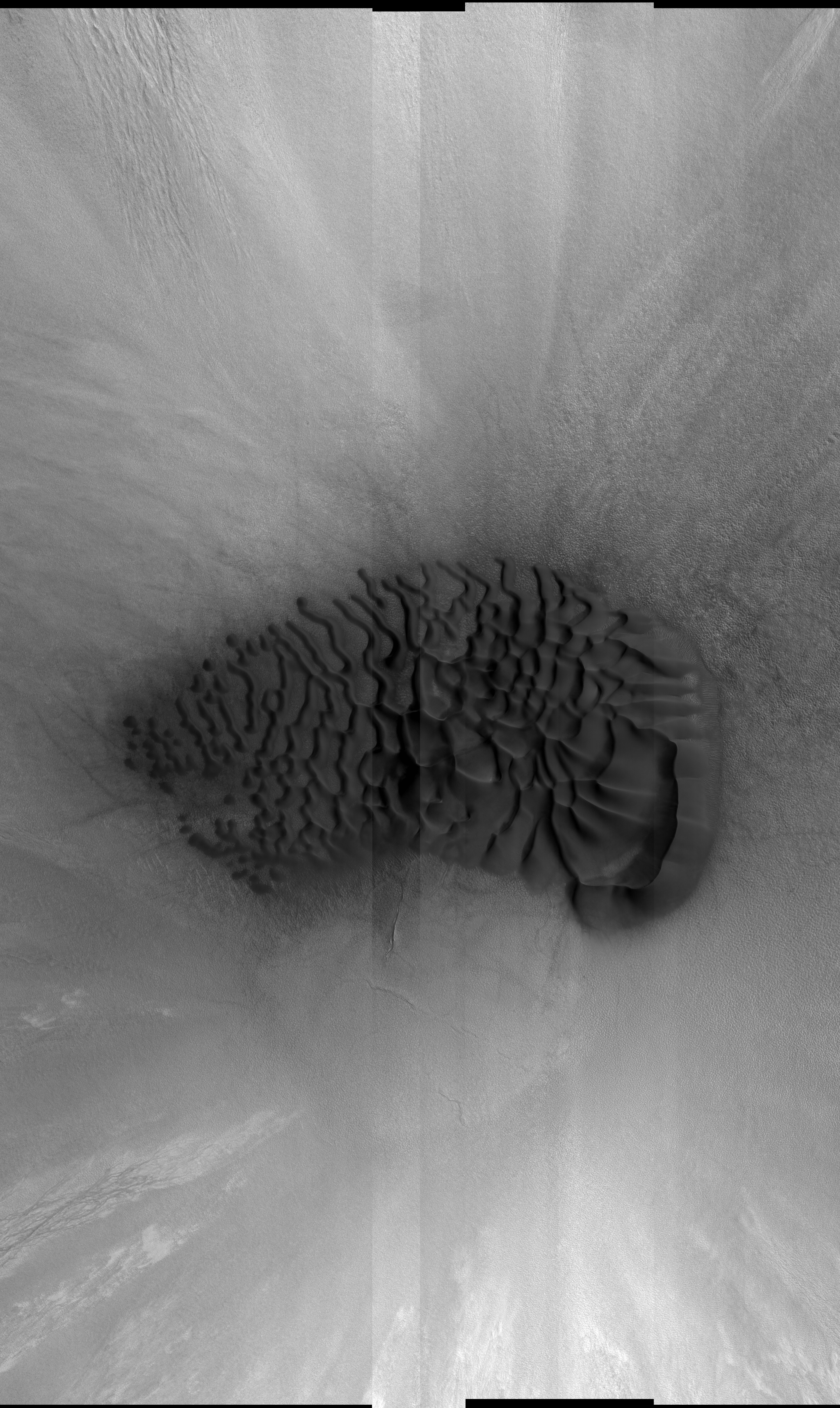 Acquisition date 16 July 2025 Local Mars time 15:09 Latitude (centered) 63.749° Longitude (East) 292.125° Spacecraft altitude 312.6 km (194.3 miles) Original image scale range from 31.3 cm/pixel (with 1 x 1 binning) to 62.6 cm/pixel (with 2 x 2 binning) Map projected scale 25 cm/pixel and North is up Map projection Equirectangular Emission angle 0.5° Phase angle 50.6° Solar incidence angle 51°, with the Sun about 39° above the horizon Solar longitude 111.2°, Northern Summer For non-map projected images North azimuth: 98° Sub-solar azimuth: 337.4° | JPEG Black and white map projected non-map IRB color map projected non-map Merged IRB map projected Merged RGB map projected RGB color non-map projected JP2 Black and white map-projected (472MB) IRB color map-projected (221MB) JP2 EXTRAS Black and white map-projected (220MB) non-map (282MB) IRB color map projected (82MB) non-map (127MB) Merged IRB map projected (142MB) Merged RGB map-projected (138MB) RGB color non map (201MB) |
