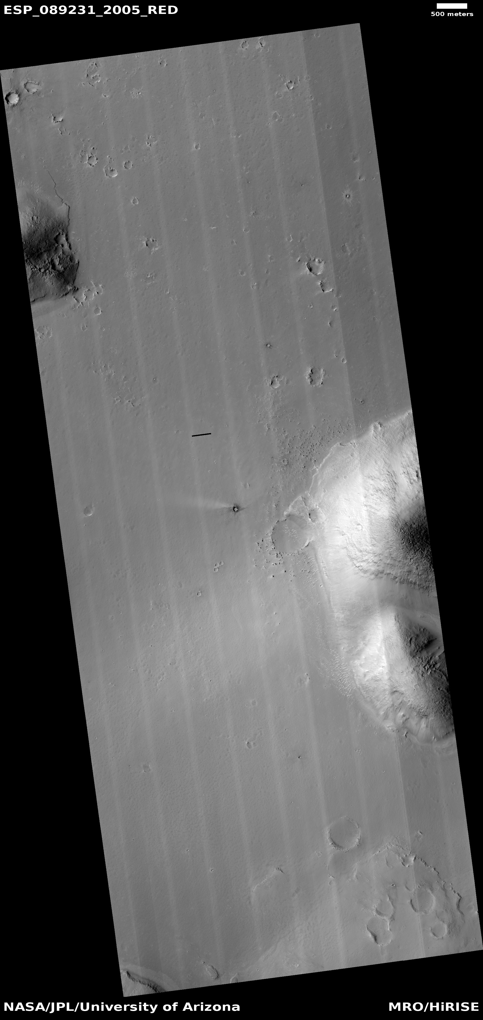 Acquisition date 09 August 2025 Local Mars time 15:22 Latitude (centered) 20.420° Longitude (East) 168.752° Spacecraft altitude 287.0 km (178.4 miles) Original image scale range 61.3 cm/pixel (with 2 x 2 binning) so objects ~184 cm across are resolved Map projected scale 50 cm/pixel and North is up Map projection Equirectangular Emission angle 21.5° Phase angle 67.8° Solar incidence angle 47°, with the Sun about 43° above the horizon Solar longitude 122.3°, Northern Summer For non-map projected images North azimuth: 97° Sub-solar azimuth: 18.2° | JPEG Black and white map projected non-map IRB color map projected non-map Merged IRB map projected Merged RGB map projected RGB color non-map projected JP2 Black and white map-projected (226MB) IRB color map-projected (131MB) JP2 EXTRAS Black and white map-projected (115MB) non-map (140MB) IRB color map projected (47MB) non-map (103MB) Merged IRB map projected (262MB) Merged RGB map-projected (236MB) RGB color non map (95MB) | ANAGLYPHS Map-projected, reduced-resolution Full resolution JP2 download Anaglyph details page ADDITIONAL INFORMATION B&W label Color label Merged IRB label Merged RGB label EDR products HiView NB IRB: infrared-red-blue RGB: red-green-blue About color products (PDF) Black & white is 5 km across; enhanced color about 1 km For scale, use JPEG/JP2 black & white map-projected images USAGE POLICY All of the images produced by HiRISE and accessible on this site are within the public domain: there are no restrictions on their usage by anyone in the public, including news or science organizations. We do ask for a credit line where possible: NASA/JPL-Caltech/UArizona POSTSCRIPT NASA’s Jet Propulsion Laboratory, a division of the California Institute of Technology in Pasadena, Calif., manages the Mars Reconnaissance Orbiter for NASA’s Science Mission Directorate, Washington. The HiRISE camera was built by Ball Aerospace and Technology Corporation and is operated by the University of Arizona. |