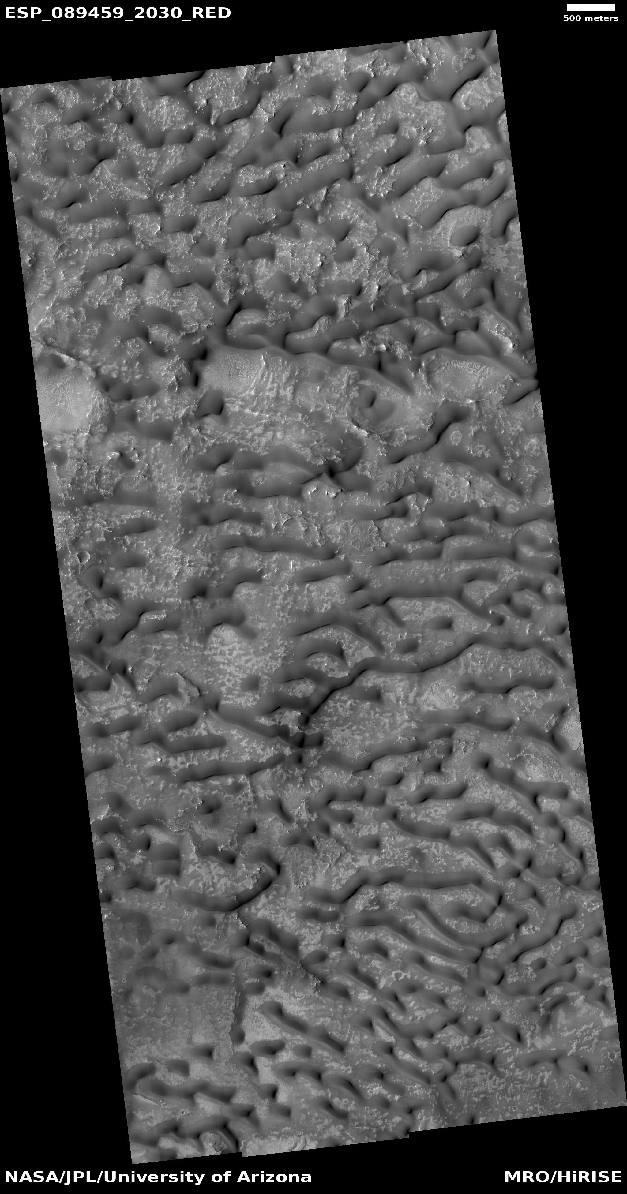 Acquisition date 27 August 2025 Local Mars time 15:32 Latitude (centered) 22.677° Longitude (East) 65.811° Spacecraft altitude 283.4 km (176.1 miles) Original image scale range from 28.4 cm/pixel (with 1 x 1 binning) to 56.8 cm/pixel (with 2 x 2 binning) Map projected scale 25 cm/pixel and North is up Map projection Equirectangular Emission angle 2.9° Phase angle 46.8° Solar incidence angle 50°, with the Sun about 40° above the horizon Solar longitude 130.8°, Northern Summer For non-map projected images North azimuth: 97° Sub-solar azimuth: 11.8° | JPEG Black and white map projected non-map IRB color map projected non-map Merged IRB map projected Merged RGB map projected RGB color non-map projected JP2 Black and white map-projected (517MB) IRB color map-projected (445MB) JP2 EXTRAS Black and white map-projected (242MB) non-map (345MB) IRB color map projected (116MB) non-map (309MB) Merged IRB map projected (169MB) Merged RGB map-projected (158MB) RGB color non map (308MB) |