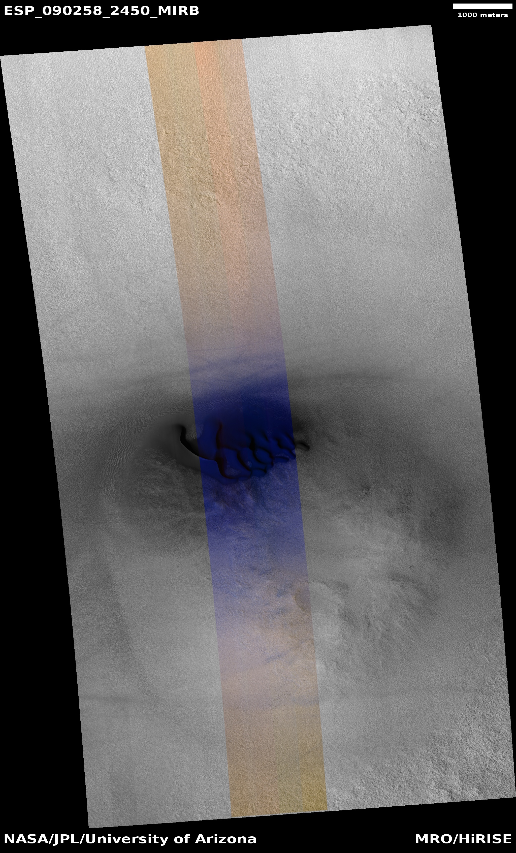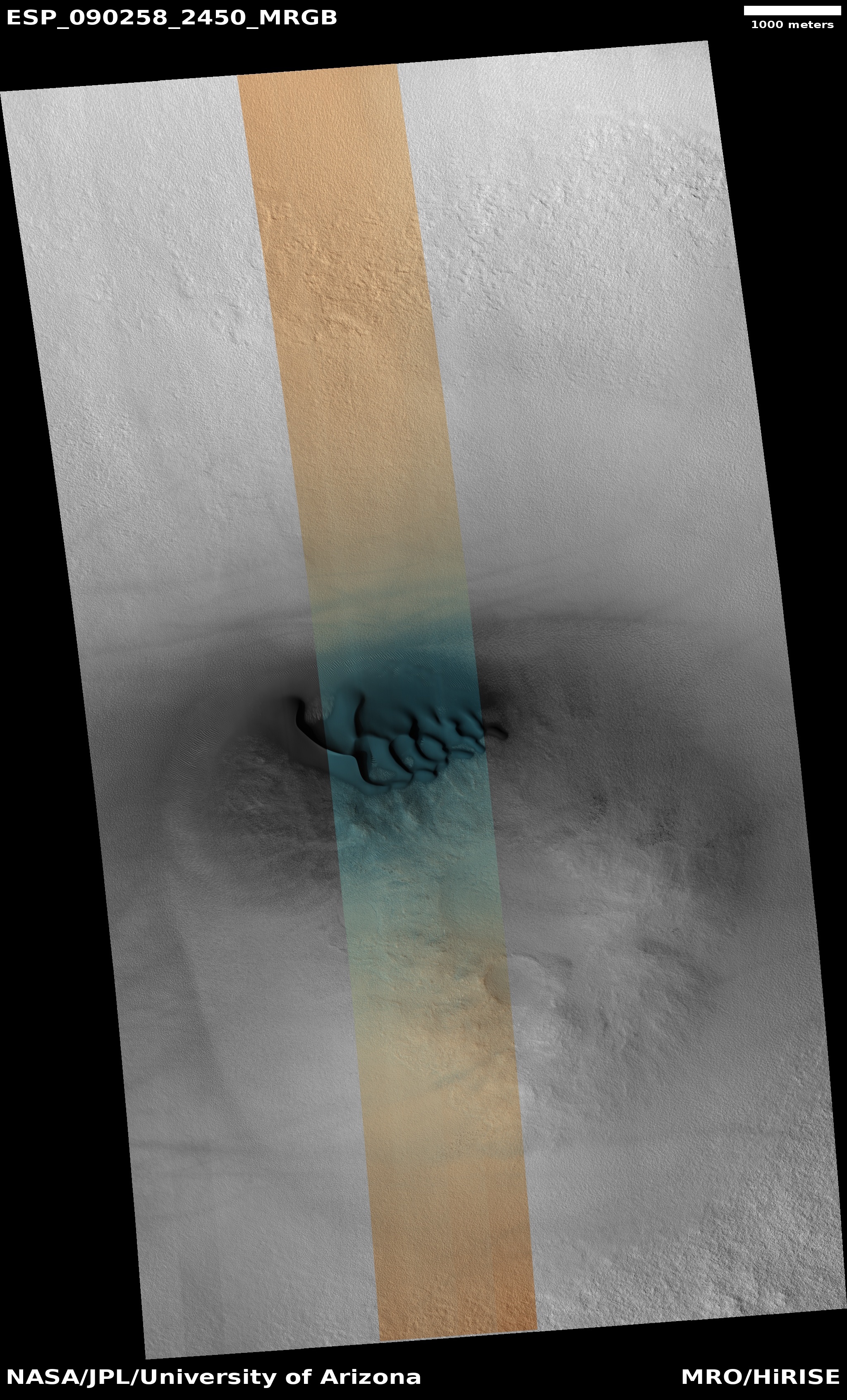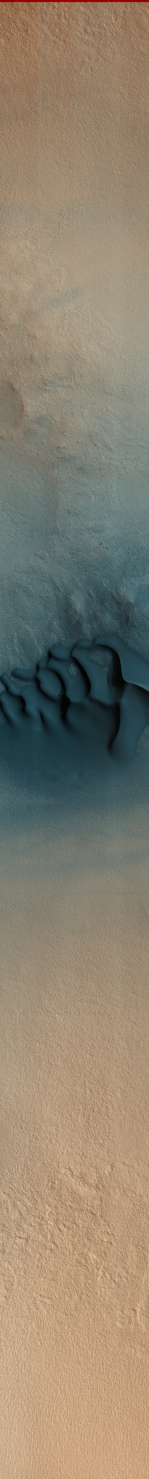 | Acquisition date 28 October 2025 Local Mars time 15:37 Latitude (centered) 64.862° Longitude (East) 209.374° Spacecraft altitude 312.0 km (193.9 miles) Original image scale range 65.3 cm/pixel (with 2 x 2 binning) so objects ~196 cm across are resolved Map projected scale 50 cm/pixel and North is up Map projection Equirectangular Emission angle 17.3° Phase angle 53.5° Solar incidence angle 69°, with the Sun about 21° above the horizon Solar longitude 162.3°, Northern Summer For non-map projected images North azimuth: 95° Sub-solar azimuth: 332.9° | JPEG Black and white map projected non-map IRB color map projected non-map Merged IRB map projected Merged RGB map projected RGB color non-map projected JP2 Black and white map-projected (280MB) IRB color map-projected (160MB) JP2 EXTRAS Black and white map-projected (117MB) non-map (113MB) IRB color map projected (41MB) non-map (95MB) Merged IRB map projected (265MB) Merged RGB map-projected (246MB) RGB color non map (91MB) | ANAGLYPHS Map-projected, reduced-resolution Full resolution JP2 download Anaglyph details page ADDITIONAL INFORMATION B&W label Color label Merged IRB label Merged RGB label EDR products HiView NB IRB: infrared-red-blue RGB: red-green-blue About color products (PDF) Black & white is 5 km across; enhanced color about 1 km For scale, use JPEG/JP2 black & white map-projected images USAGE POLICY All of the images produced by HiRISE and accessible on this site are within the public domain: there are no restrictions on their usage by anyone in the public, including news or science organizations. We do ask for a credit line where possible: NASA/JPL-Caltech/UArizona POSTSCRIPT NASA’s Jet Propulsion Laboratory, a division of the California Institute of Technology in Pasadena, Calif., manages the Mars Reconnaissance Orbiter for NASA’s Science Mission Directorate, Washington. The HiRISE camera was built by Ball Aerospace and Technology Corporation and is operated by the University of Arizona. |
